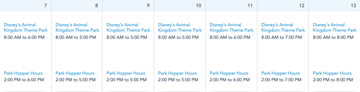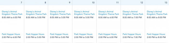 Finally, Disney’s Animal Kingdom has varying hours as well. On Sunday, March 7th and Thursday, March 11th, Animal Kingdom will be open from 8AM-6PM. From Monday, March 8th through Wednesday, March 10th, Animal Kingdom will be open from 8AM-5PM. On Friday, March 12th, Animal Kingdom will be open from 8AM-7PM. And on Saturday, March 13th, Animal Kingdom will be open from 8AM-8PM.