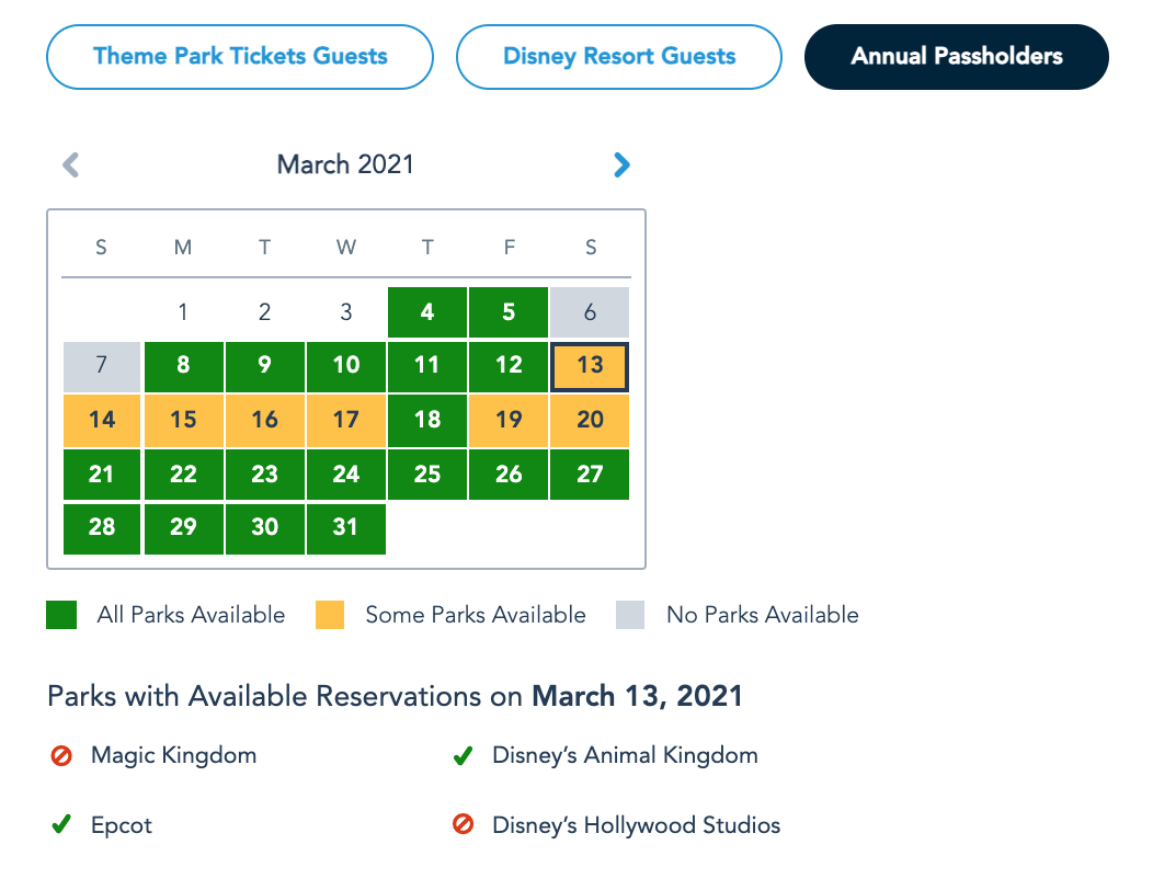 Current Disney Park Pass Reservation Availability the Week of March 7th
