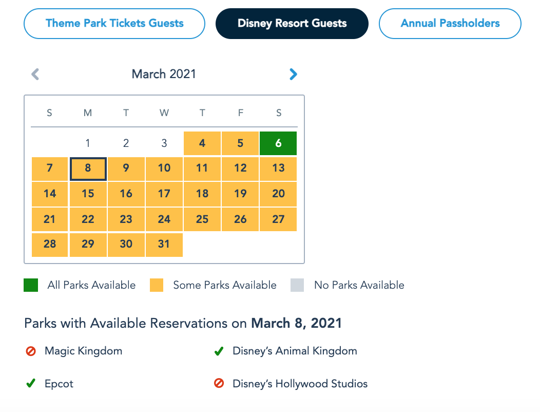 For Disney Resort Guests, Park Pass Reservations are currently available at Magic Kingdom, EPCOT, and Disney’s Animal Kingdom on March 7th as well as from March 9th through March 11th.
