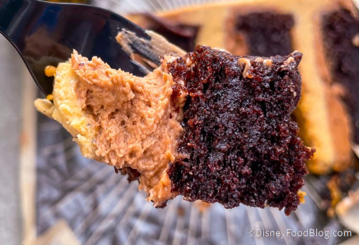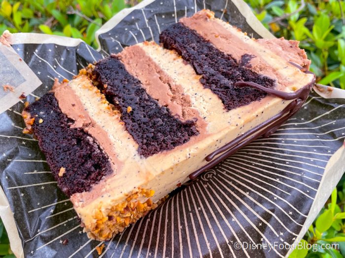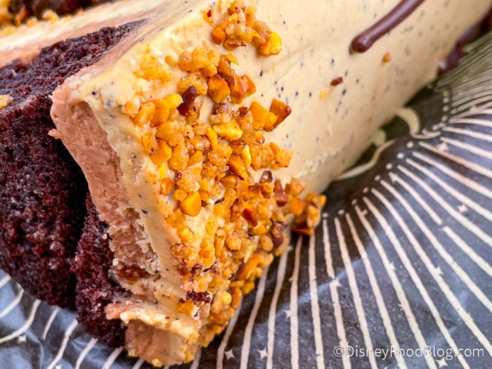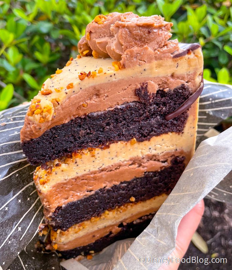 So when we found ourselves at Disney Springs today, how could we resist dropping by? We decided to go for a slice of Hazelnut Mocha Cake because well, hazelnut + mocha sounds like heaven to us! To be exact, it’s Chocolate cake layered with Mocha and Hazelnut Frosting with Crunchy Hazelnut Pieces. We also thought we noticed hints of peanut butter.
