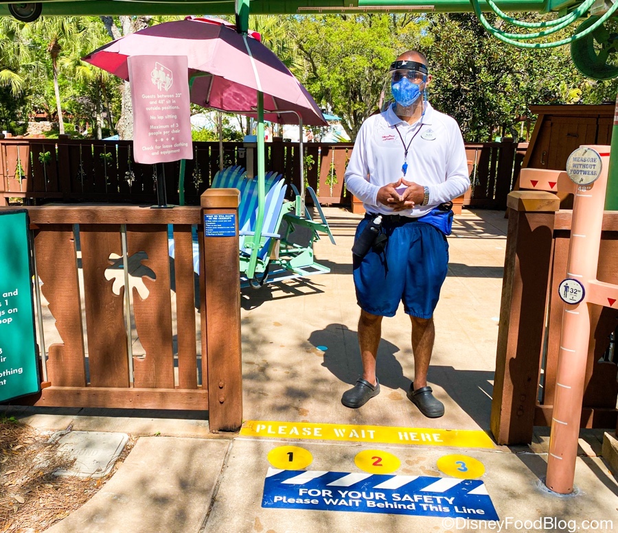 It is the first water park to reopen at Disney World and is operating under a variety of health and safety guidelines, much like the theme parks. This includes reduced capacity, temperature screenings, physical distancing markings, and face coverings. The face mask policy is a little different than we’ve experienced in the parks, so we headed over to experience it for ourselves!