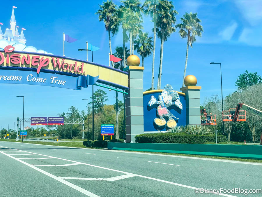 Over at the Walt Disney World Welcome Sign at World Drive, the makeover continues! From this angle, you can see the right side of the sign has made major progress. Donald and Mickey can be seen in front of a freshly painted blue background, beside newly painted gray pillars with gold accents. On the left side, Minnie looks the same as always (for now)!
