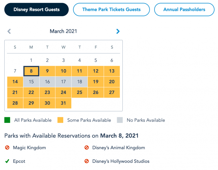 Disney Resort Guests and Theme Park Ticketholders will note limited options when it comes to reservations. Disney’s Hollywood Studios, for instance, has no availability remaining for the whole month. Magic Kingdom is only available on March 10th, 26th, and 27th at the time of writing.