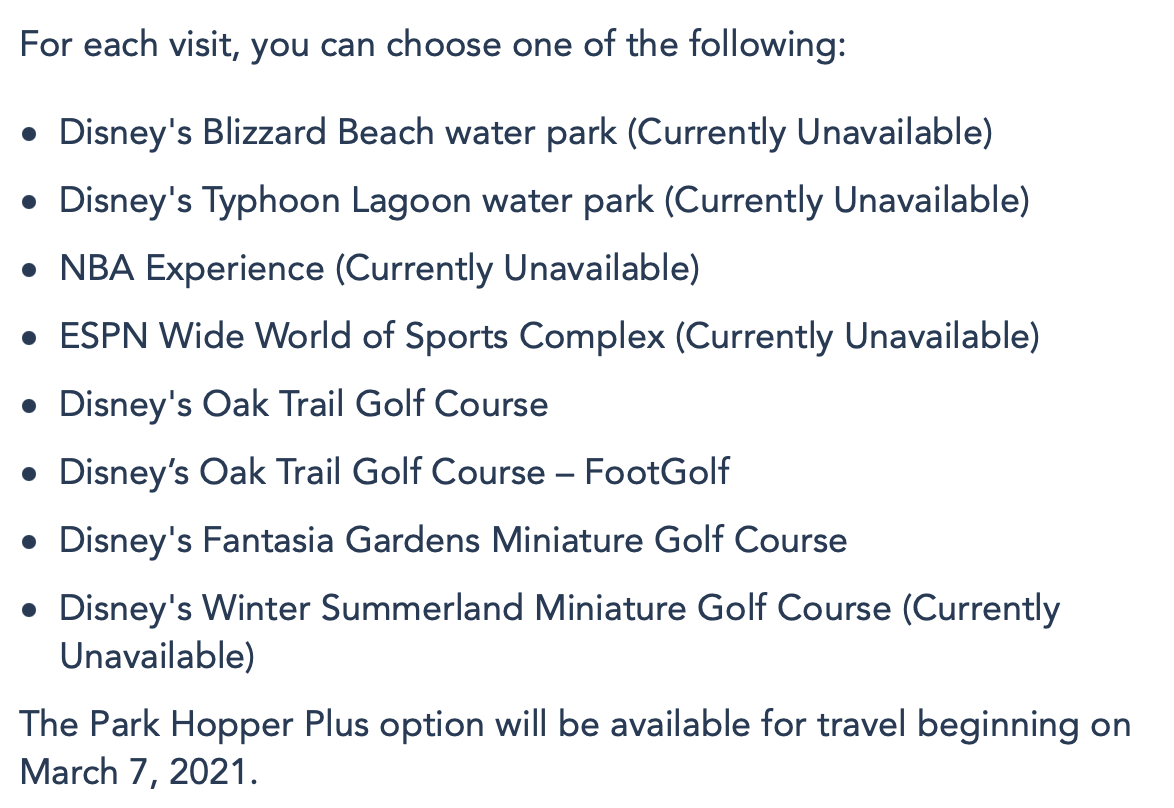 For each day with that Park Hopper Plus add-on, you can visit multiple Disney parks in addition to another Disney experience like Fantasia Gardens Mini Golf or Blizzard Beach. Keep in mind that some of these activities (like Typhoon Lagoon and the NBA Experience) are temporarily unavailable.