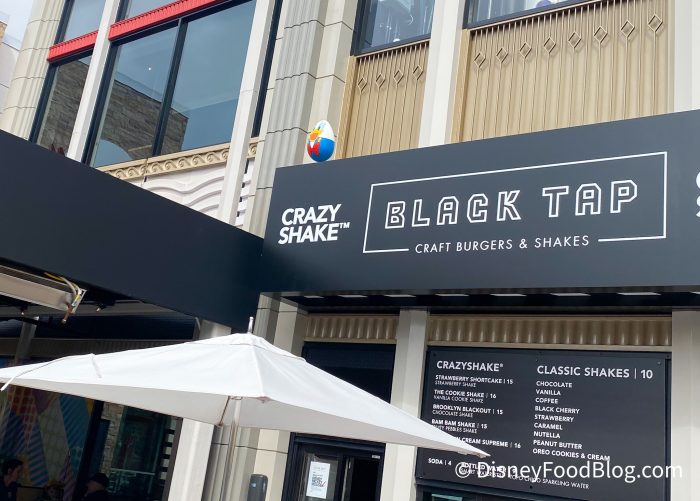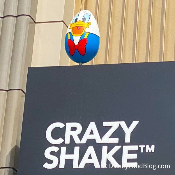 His egg is perched on top of the Crazy Shake to-go window at Black Tap Craft Burgers & Shakes.