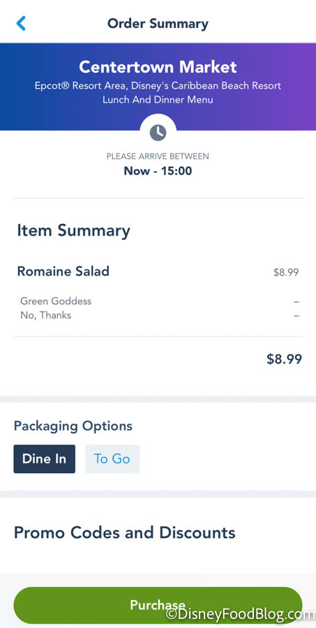 When your food is ready, it will come out in the packaging you choose. You can find a seat and eat in, or head off to your next adventure with the food in tow! We know, we know, we ordered the Romaine Salad (which is very unlike us and our sweet tooth) but we’ve got to eat some greens every once in a while! And, thanks to the new packaging option, it came out just right! Stay tuned for more Disney news and updates!