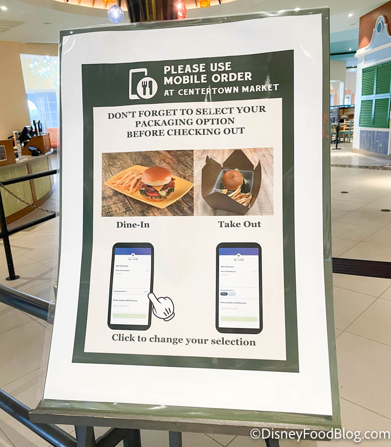 When we were hanging out at Disney’s Caribbean Beach Resort, we decided to swing by Centertown Market and pick up something to eat. We’re glad that we swung by the restaurant before placing our order because we spotted a Mobile Order sign we haven’t seen before.