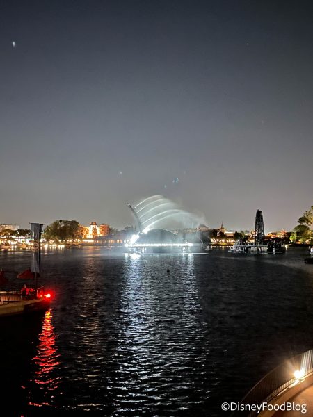 Harmonious will be one of Disney World’s biggest nighttime spectaculars yet, with several special effects including custom-built LED panels, choreographed moving fountains, lights and lasers, and pyrotechnics. And tonight, the water effects were being testing on one of the barges!