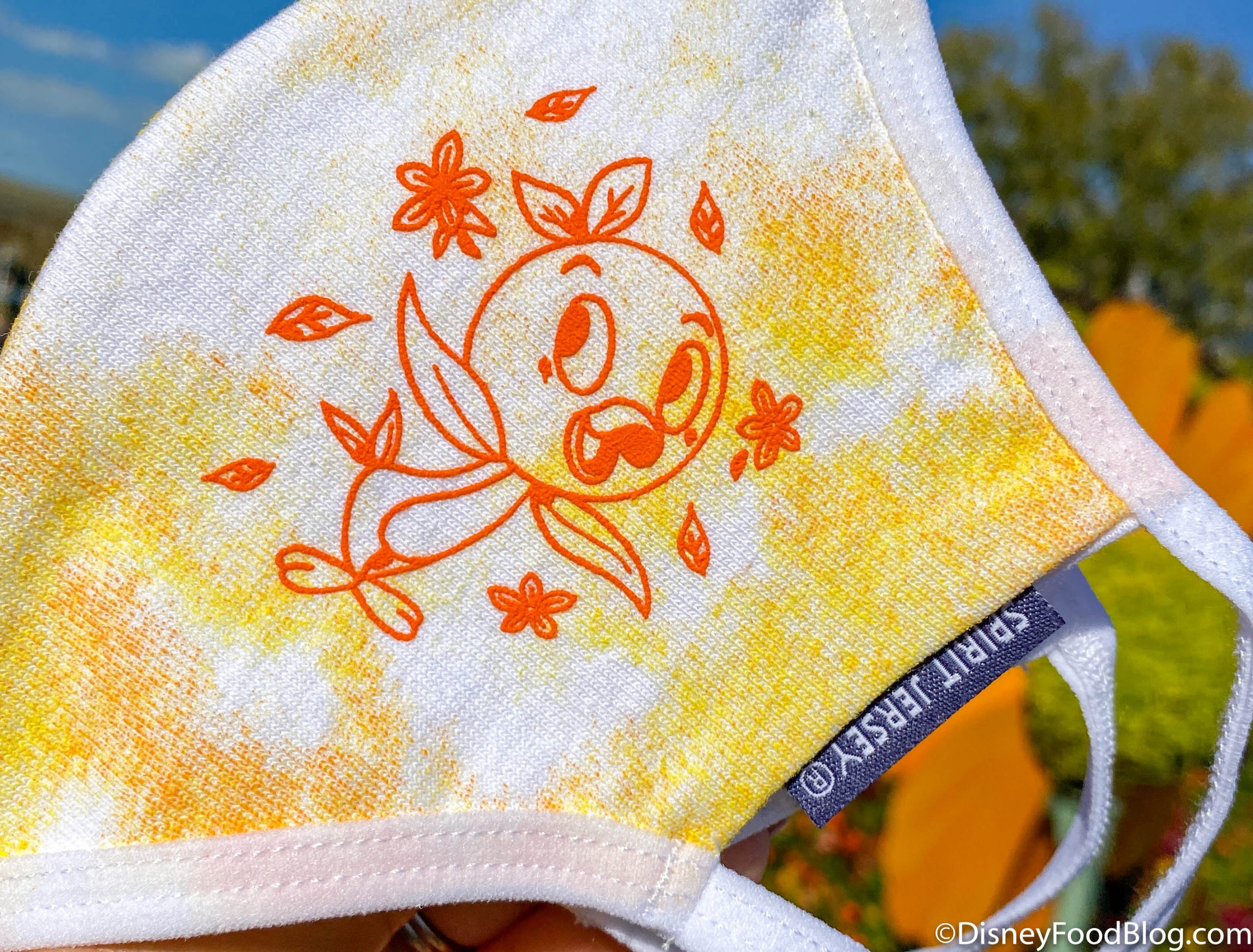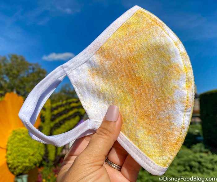 We found this mask at Port of Entry in EPCOT today. It’s got a sort-of yellow tie-dye pattern on it with (of course) the adorable Orange Bird on one side surrounded by flowers and leaves.