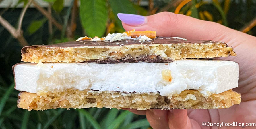 Now, it may look kind of simple, but it’s actually far from it! This snack featured a thick square of marshmallow sandwiched between two shortbread cookies that have pretzel pieces in them! Plus, it’s dipped in chocolate and topped with pretzel and potato chip pieces, and flaky salt.