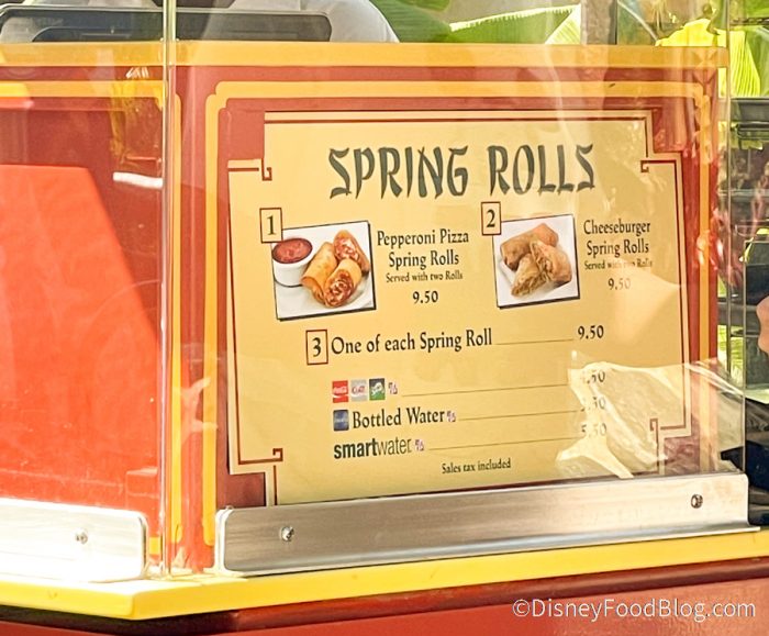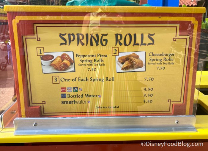 That price is ridiculous! Years ago the spring roll was only $2 for one and also it was a vegetable one. Now you don’t even have that choice, you only get a choice of 2 meat ones. Disney is digressing in their food choices.