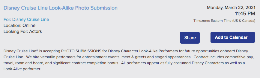 Now, Disney is searching for Character Look-Alike Performers for roles onboard the cruise ships. According to the Disney Careers website, Disney Cruise Line is now accepting photo submissions for future performance opportunities including entertainment events, meet & greets, and staged appearances.