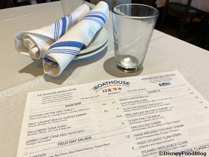 What’s it like when you sit at your table? Crisp white linens, white and blue cloth napkins, and a paper menu.