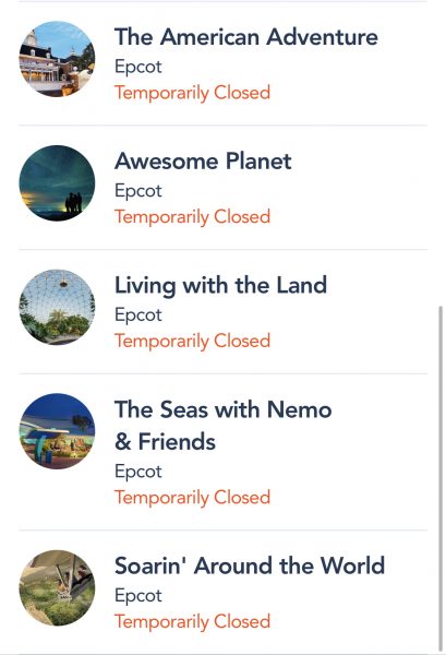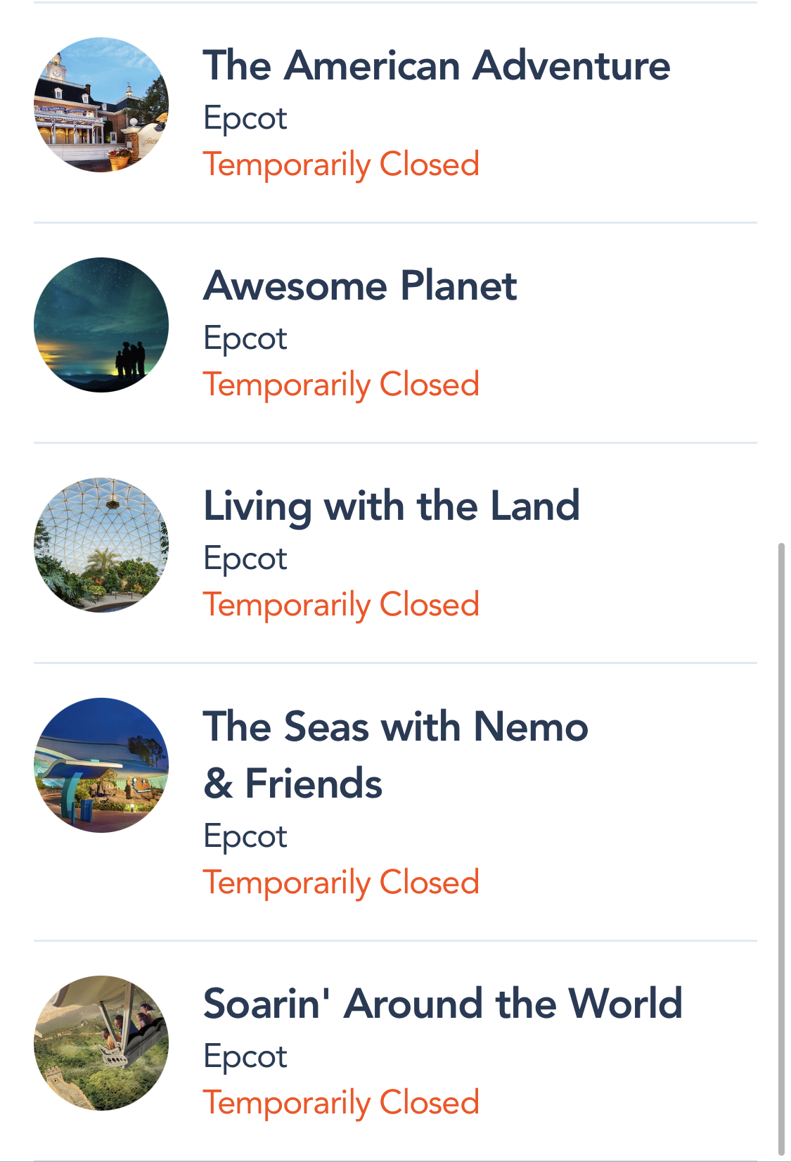 The American Adventure, Awesome Planet, Living with the Land, The Seas withe Nemo and Friends, and Soarin’ Around the World are ALL currently closed! A little earlier, Test Track was down, too, but it’s been reopened.