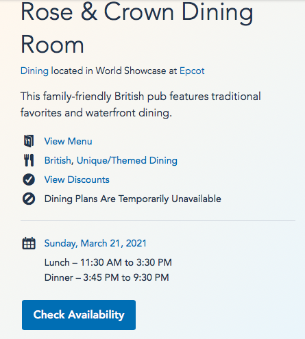 Earlier today we checked the Disney website, and we saw that there are no hours of operation listed for the Rose & Crown Dining Room for March 20th…