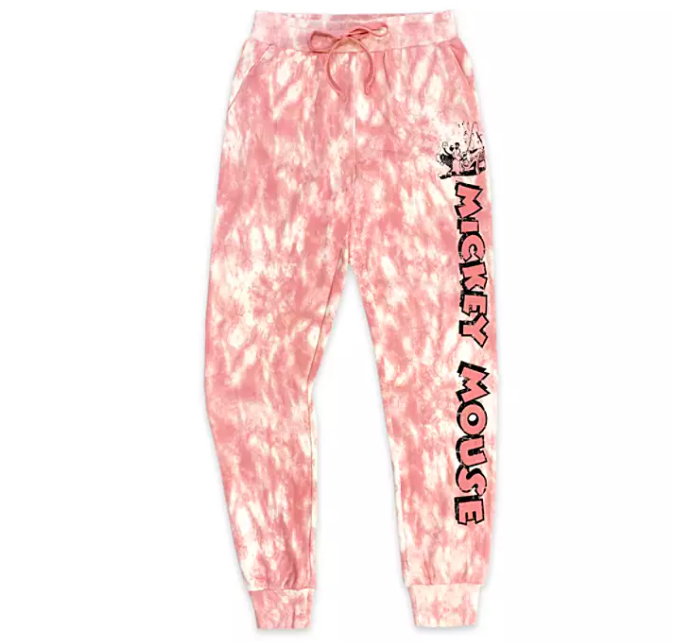 The women’s set is pink! The tie-dye lounge pants have that same distressed pattern, with the Mickey Mouse logo down one leg.