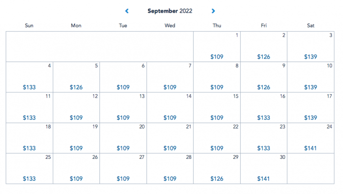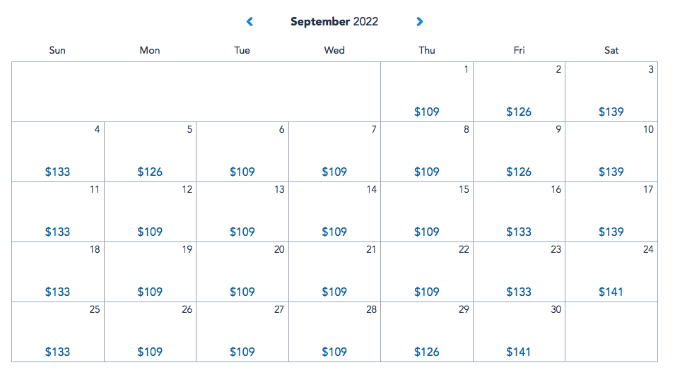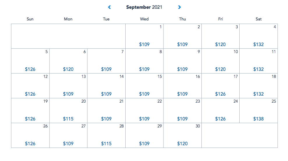 We also took a look at Food and Wine dates. For this comparison, we used September, which can sometimes be a slower month with kids back in school, but is a month when the Food and Wine Festival would be going on. Here’s a look at 1-day, 1-park prices for September of 2021.