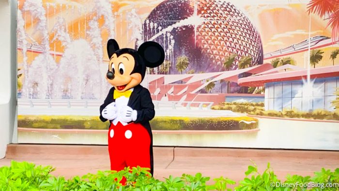 Recently, Mickey also popped up at the entrance of EPCOT, with Minnie nearby.