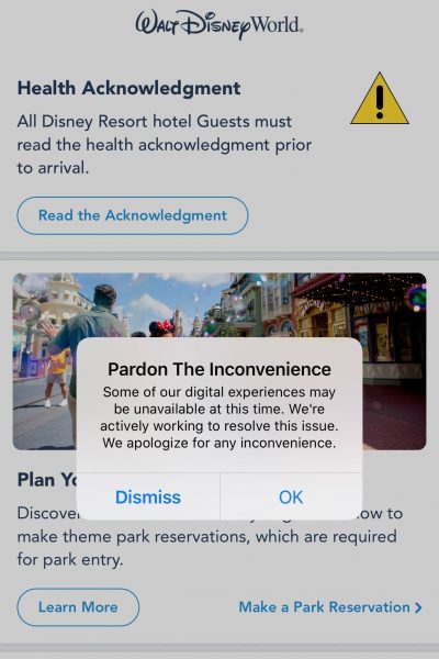 Apps on your phone crash sometimes, and the My Disney Experience app is no exception. In our experience, we’ve seen the app open, but we got a message that “some of our digital experiences may be unavailable at this time.”