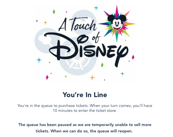 Just last week, Disney released tickets to the A Touch of Disney event at Disney California Adventure and it was kind of a rollercoaster trying to grab tickets. After the wait time was jumping around, the site eventually “paused” and said they were “temporarily unable to sell more tickets.” It later resumed but sold out very quickly.
