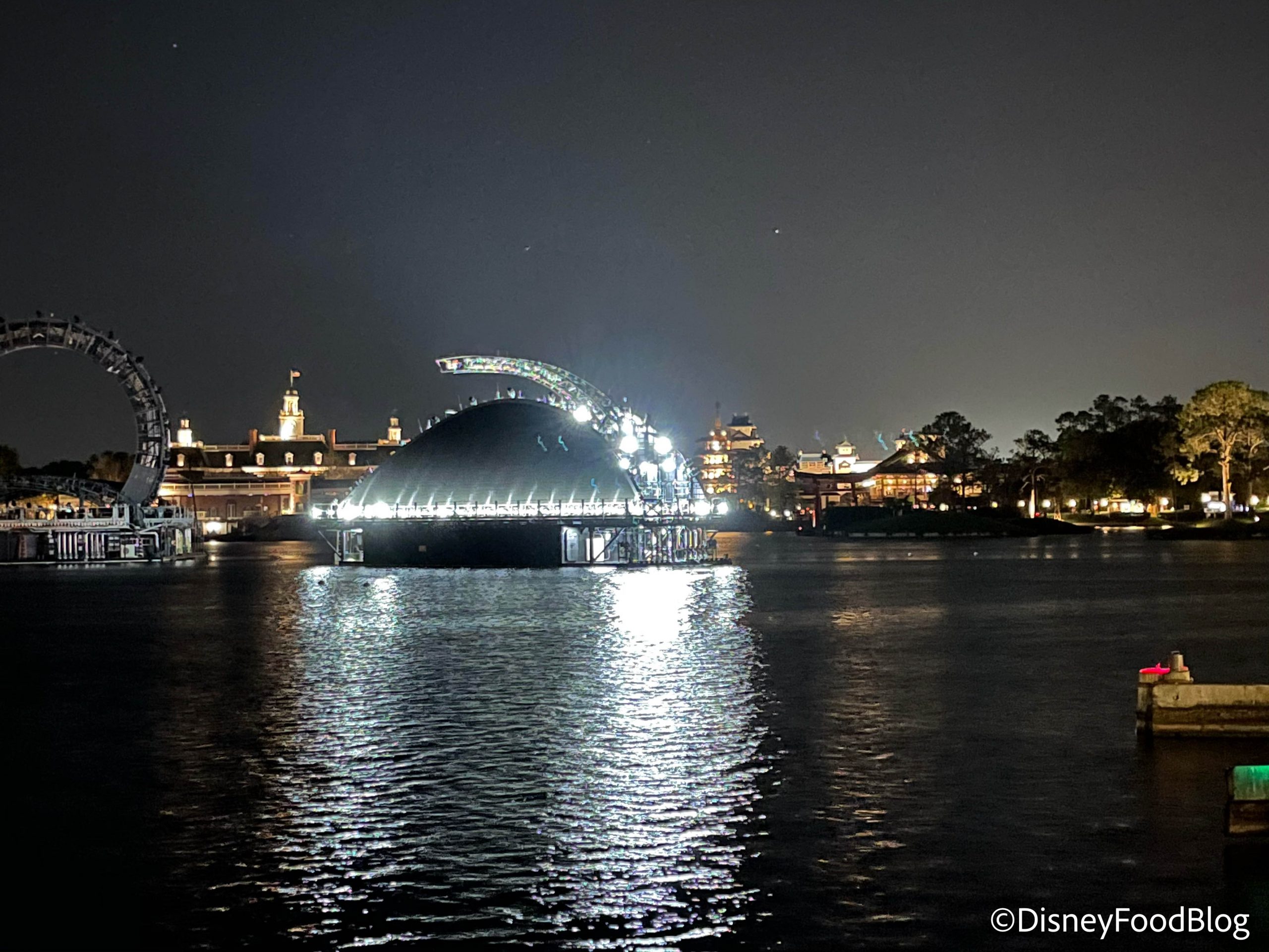 We also saw the screens on the barges lit up in the form of a grid, which is often used for projection mapping. Recently, the centerpiece of the show made its way onto World Showcase Lagoon. It’s a six-story tall ring that will have moving fountains and lights, pyrotechnics, and a high-density water curtain.
