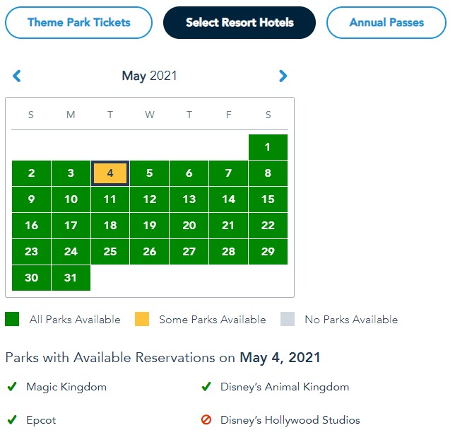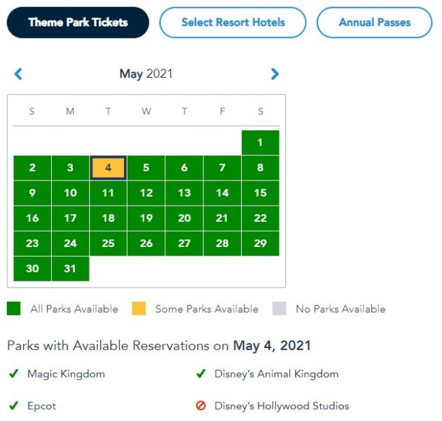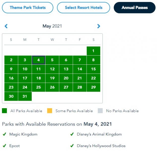 At the time of writing, Annual Passholders still have availability in all four parks for the entire month of May.