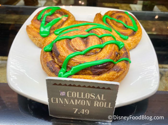 In Disney’s Animal Kingdom, you can grab a Mickey Colossal Cinnamon Roll at Creature Comforts! For St. Patrick’s Day, it’s covered in a green icing drizzle.
