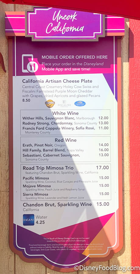 Throughout the park, various restaurants and food spots are open, including some booths that were previously at Disney California Adventure Park’s Food & Wine Festival. Looking for a cheese plate, mimosas, or some Chardonnay during your trip to DCA? Then we’ve got just the spot for you — the Uncork California marketplace!