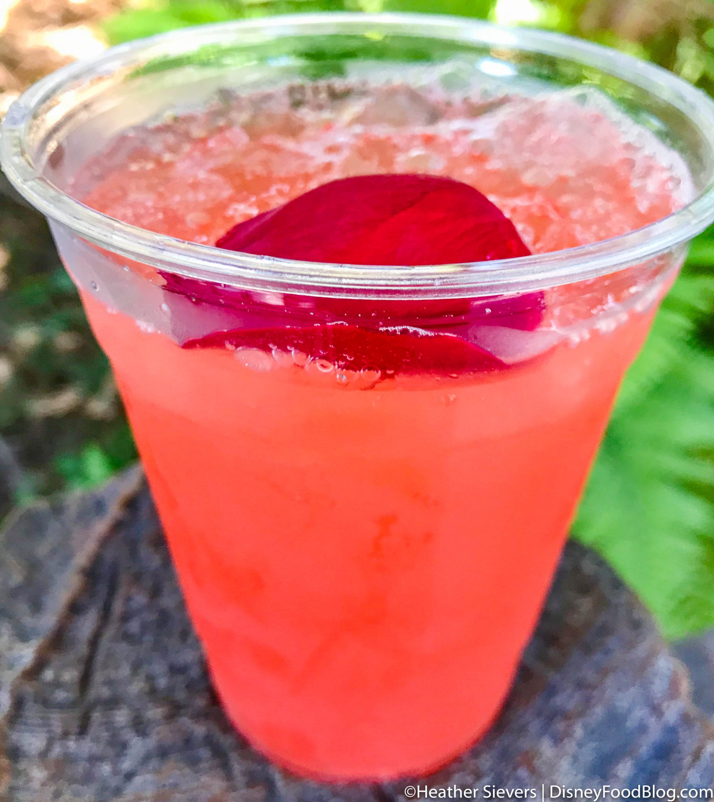 Aside from those 2 food items, Golden Dreams has one specialty drink, and it’s non-alcoholic. The entire family can sip the beautiful Strawberry-Rose Lemonade. This is a returning drink, which we spotted last year at the Golden Dreams booth at the California Adventure Food and Wine Festival. But, the ingredients seem a bit different this year. Last year, the drink was described as having strawberry, rose, pure amber honey, and fresh lemon juice. This year, it’s got strawberry puree, rose syrup, and fresh lemon juice.