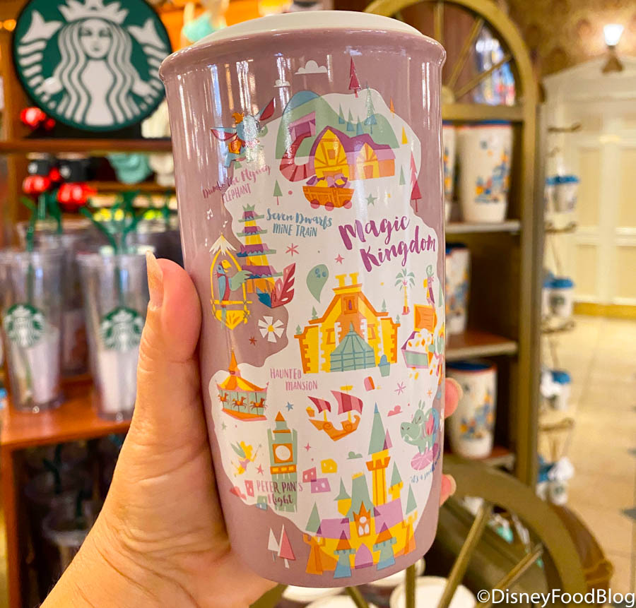 Then there are the park-specific mugs which are super colorful and oh-so-cute. The Magic Kingdom Starbucks Ceramic Travel Tumbler is a pretty purple color and features icons for some of your favorite attractions.