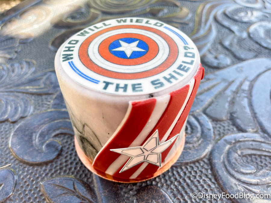And, the side is decorated with intricate Captain America details. Now, you know we can’t resist giving Disney snacks a try no matter how good they look on the outside, so we dove right in!