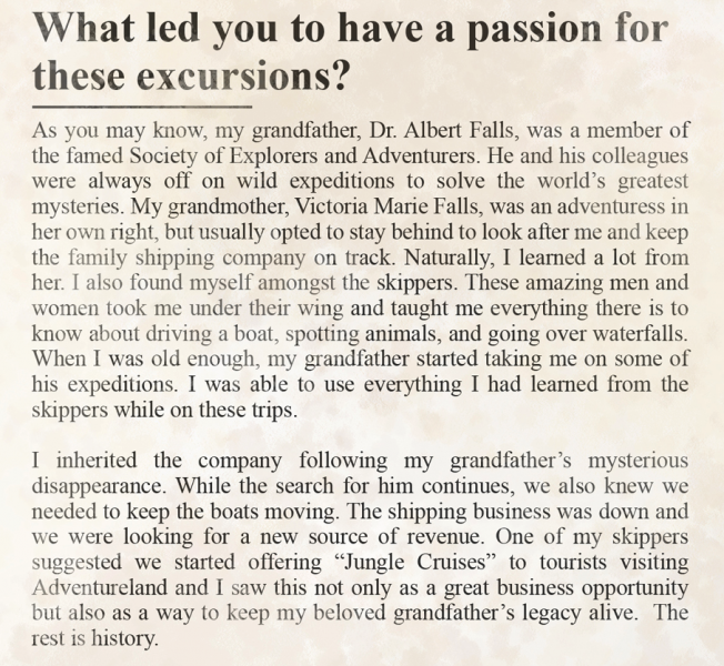 According to her interview, Alberta spent a summer in Adventureland with her grandparents and fell in love with it, so it turned into the summer that never ended. Alberta also shares how her grandfather, Dr. Albert Falls, was part of the Society of Explorers and Adventurers (SEA). She said that she learned a lot from her grandparents as well as the skippers. She then inherited the company following her grandfather’s mysterious disappearance…ooooOOoooo!! Then, a skipper suggested they start offering “Jungle Cruises” to tourists and the rest is history!
