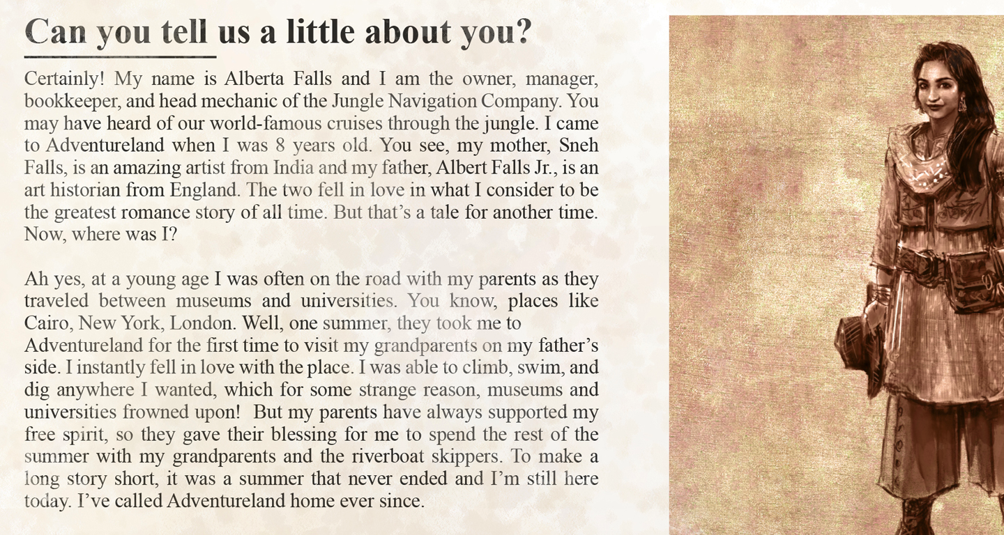 And, as luck (and we have the feeling, a little magic) would have it… Disney recently “uncovered a copy of an interview with Alberta Falls that was featured in a 1938 issue of The Daily Gnus about her and the World-Famous Jungle Cruise.” In it, Alberta Falls shares more about her story, how she got to Adventureland, and more about Dr. Albert Falls and other unique characters that might form part of this backstory.