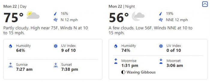 The next day, March 23rd, brings us warmer temps hitting some nicer springtime weather at 81 degrees during the day and keeping that low down at a nice 62 degrees.