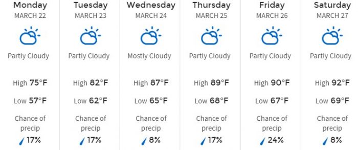 Monday, March 22nd will start the week with the lowest temperatures. That day is going to max out at a 75-degree high and we’ll see 56 degrees at night.