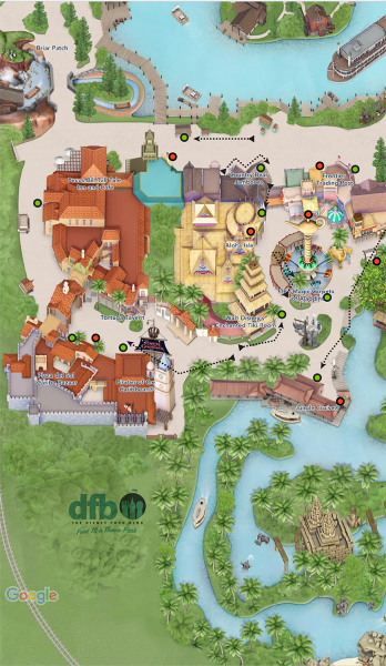 You can see even more of Adventureland in the photo below, but also little portions of Frontierland up above. Again, you can take a look at those green and red dots to show you where you’ll typically be able to find the entrances and exits to some of your favorite rides and restaurants. Note how the Pirates of the Caribbean line moves to the right of the building (if you’re looking at it from the top) when it extends beyond the designated queue area.