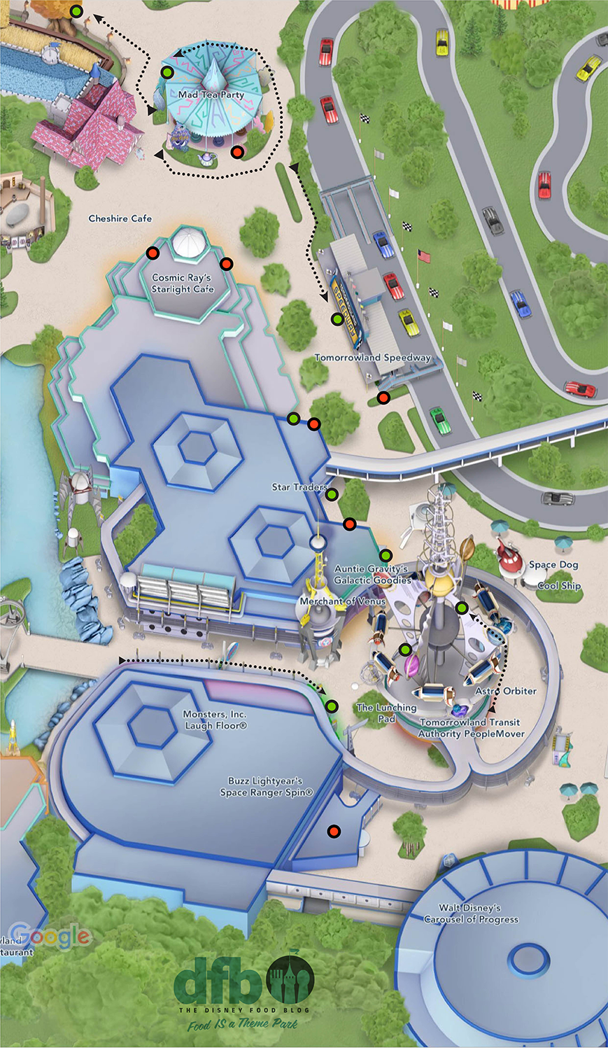 For example, you can see how there are red dots near those side entrances at Cosmic Ray’s Starlight Cafe and only one green dot for the restaurant as you move further along the side of the building. So, keep in mind that you may have come into Cosmic Ray’s through other doors in the before times, but now the set-up has changed.