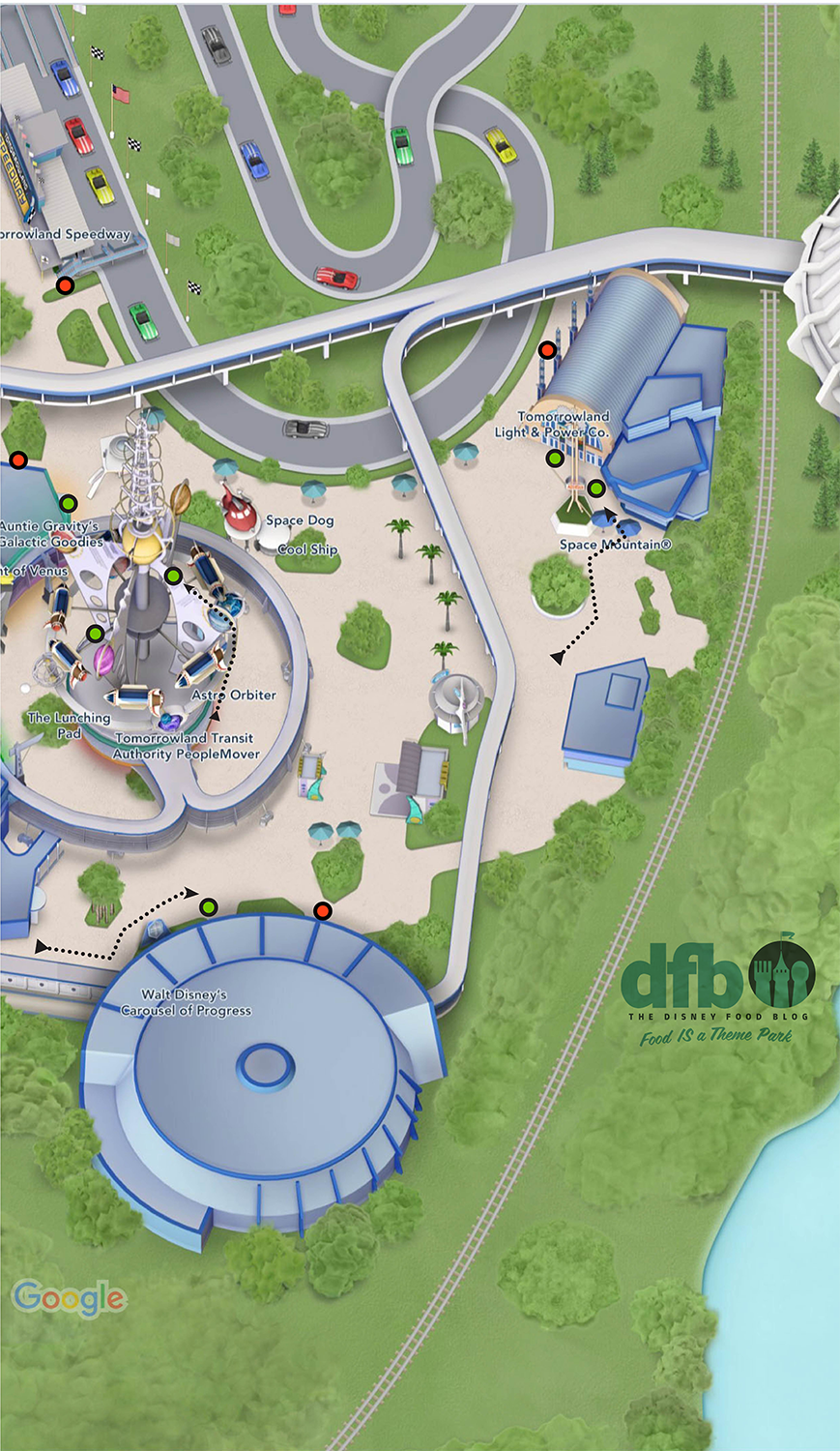 Moving further into Tomorrowland, you can see the entrance and exit areas for attractions like Space Mountain, Walt Disney’s Carousel of Progress, and more.