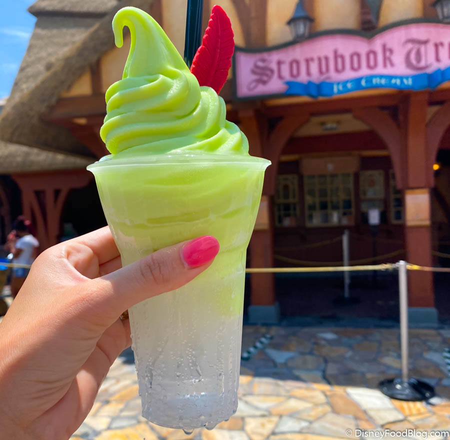 Another popular Dole Whip creation is the Peter Pan Float from Storybook Treats in Fantasyland. The float is made with Lime Dole Whip, Sprite, and a chocolate feather to make it perfectly Instagramable!