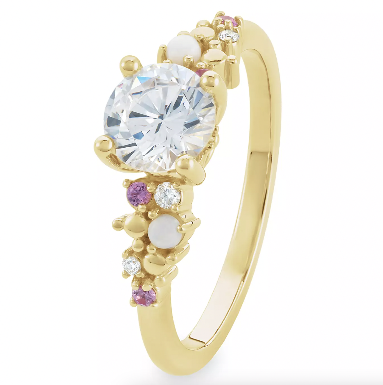 If you’re looking for one of the items that you can classify under “most worn,” Disney’s Fairy Tale Weddings Engagement Ring might qualify! The ring features a 1-carat diamond front and center with white opal stones, sapphires, and more diamonds surrounding it.