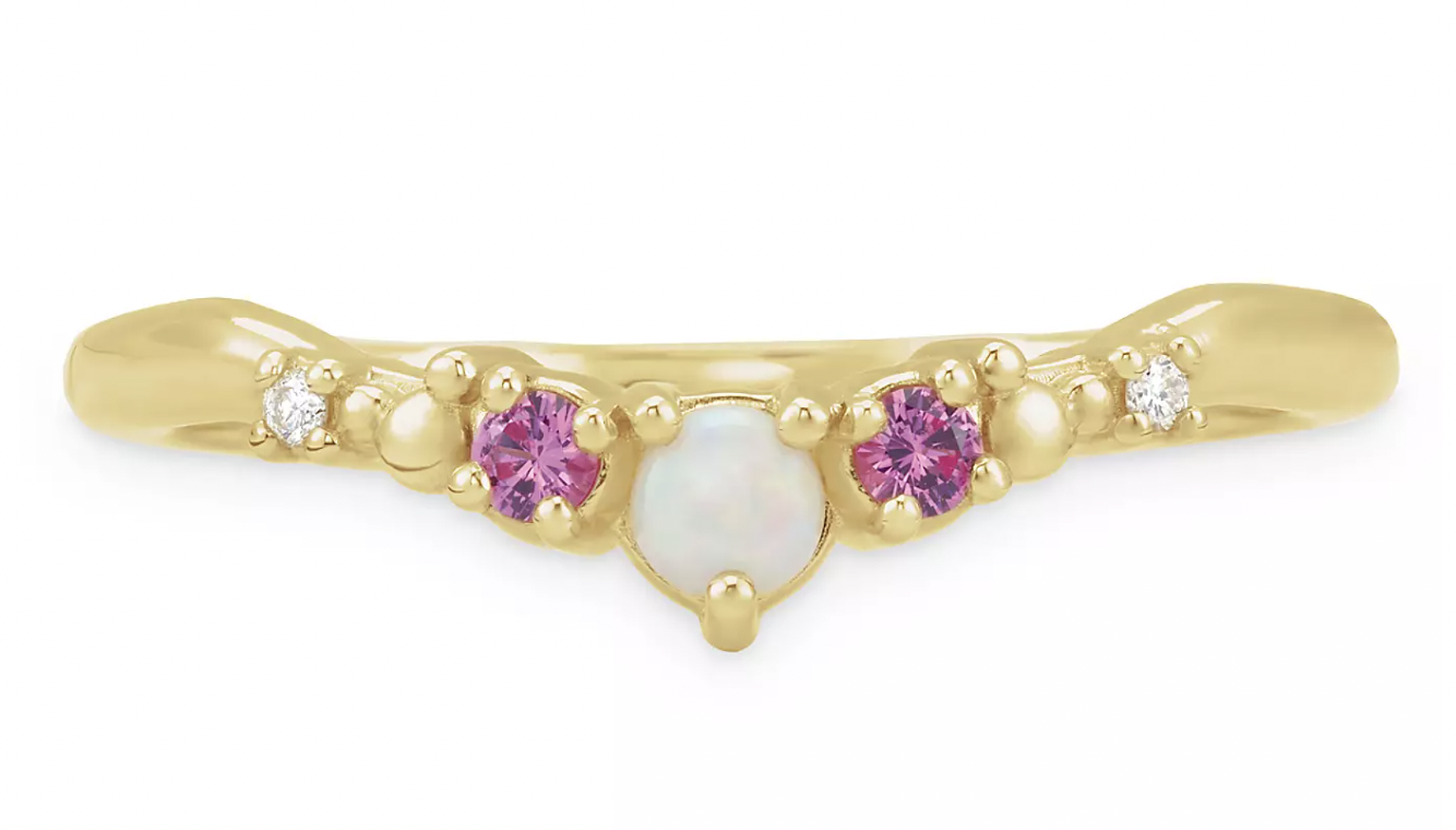 And, you can make it a matching set with Disney’s Fairy Tale Weddings Opal Wedding Band. The yellow gold band features the same opal stones, sapphire, and diamonds that are on the engagement ring’s band. And, if you look close, you might even spot a hidden Mickey or two!