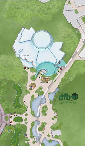 Then, we move over to Future World West and The Seas With Nemo & Friends. You can see entrances and exits below for the ride, the entire pavilion, and Coral Reef Restaurant. You can also see the entrance and exit to The Land pavilion in the map below and the way that the line to get into the pavilion will typically stretch.