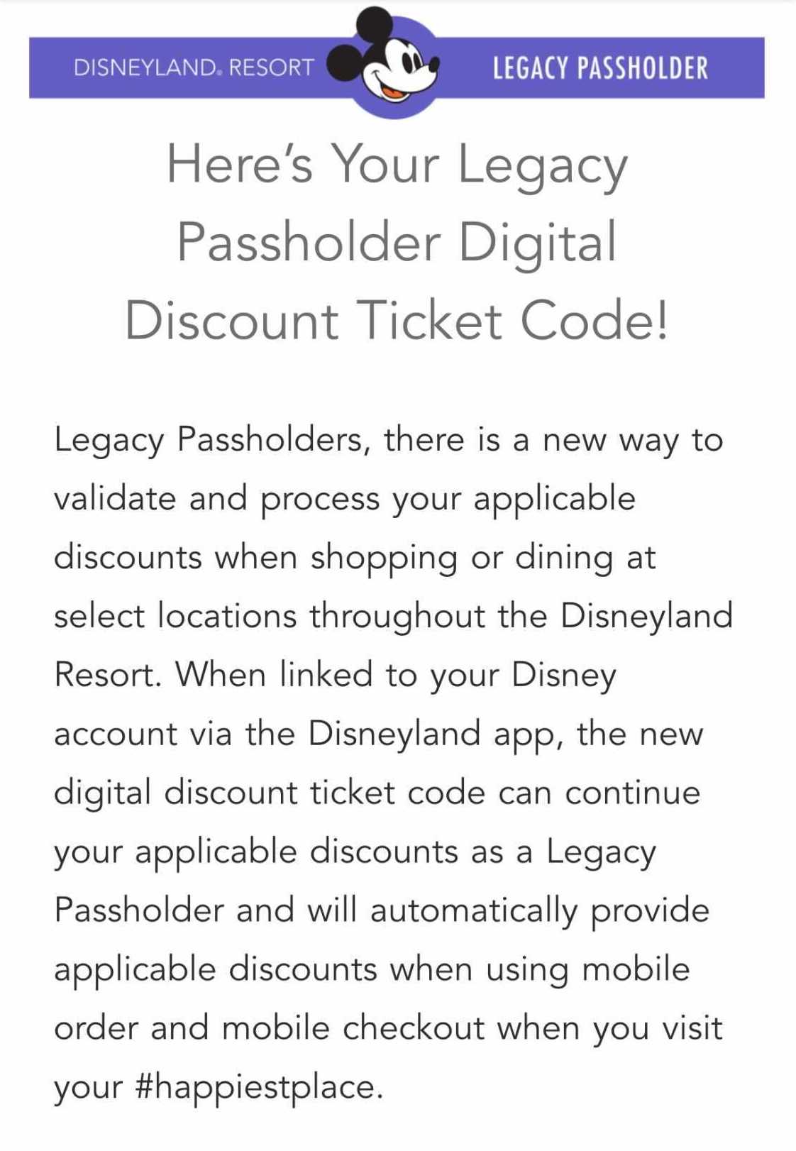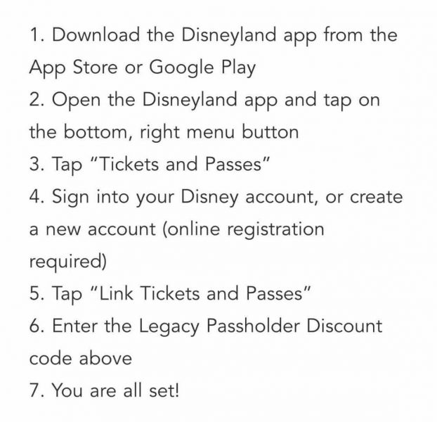 According to the email, those who have previously linked the legacy pass to the Disney account through the Disneyland app should already have that discount code. To check that it updated correctly, open up the Disneyland app and select “Tickets and Passes.” If it worked correctly, you should see the discount code pop up and you are good to do all the food and merchandise shopping you please!