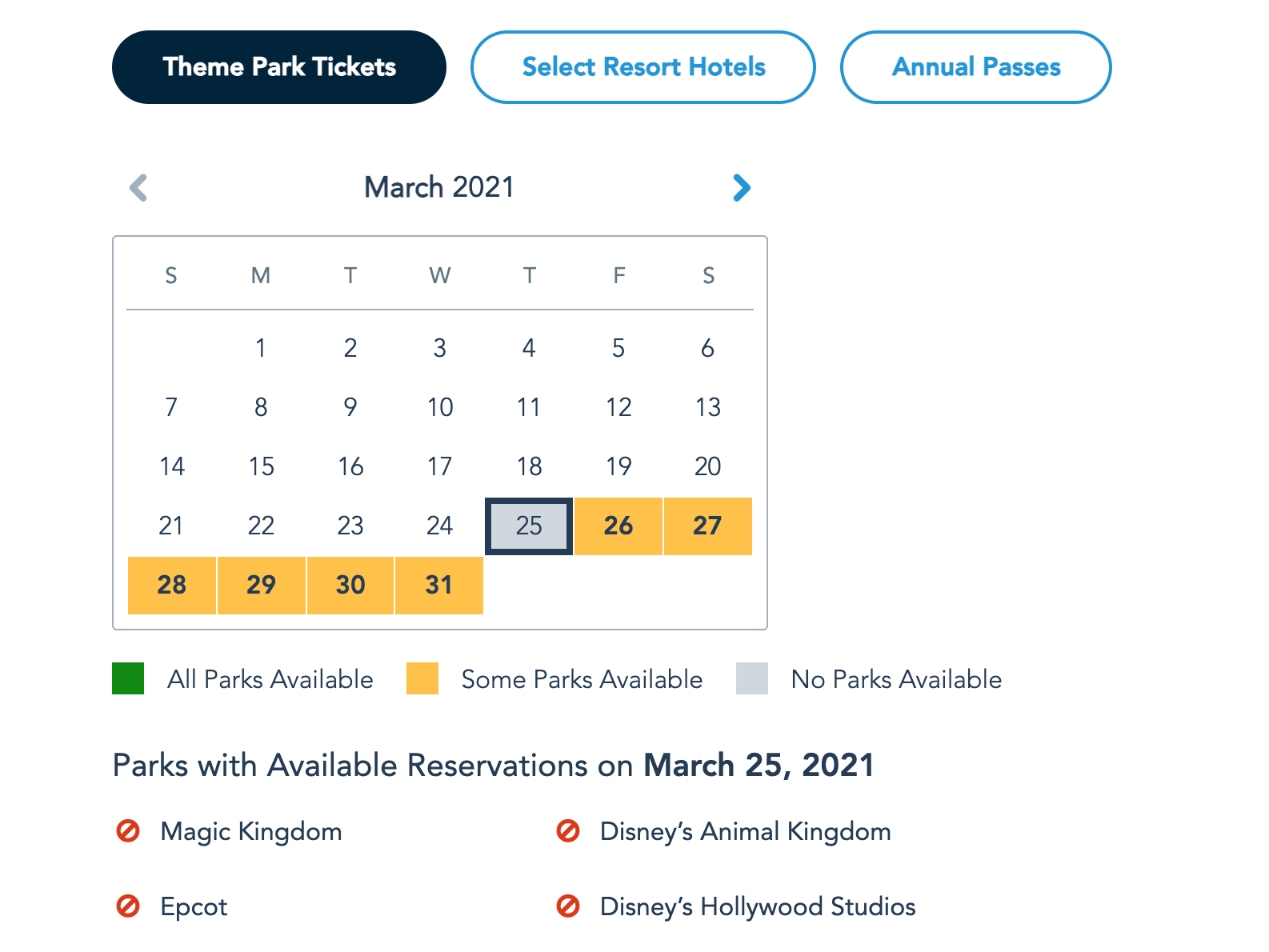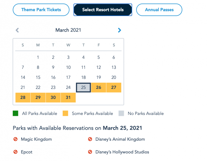 The same is true for the first half of April, with more options opening up later. In fact, the availability calendars for theme park ticket holders and Resort guests are nearly identical!