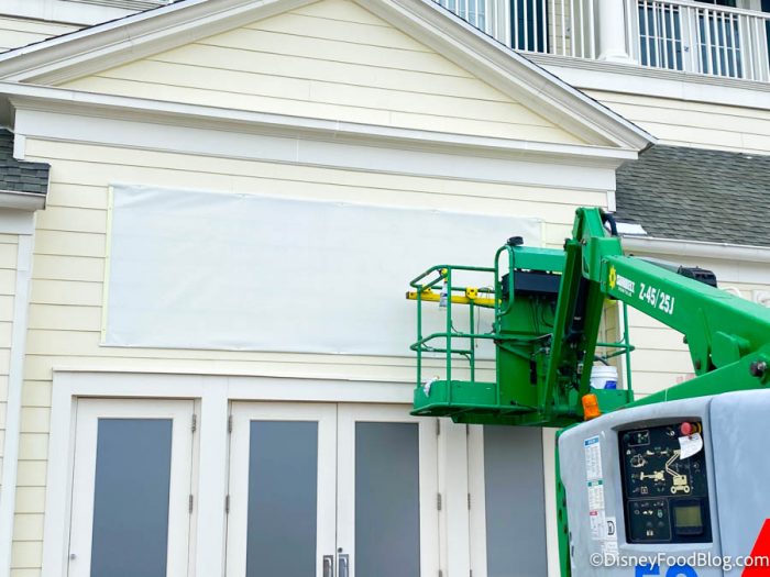 Today, a boom lift was out in front of the store as workers worked on the main signage area, adding a white covering to the space above the door.