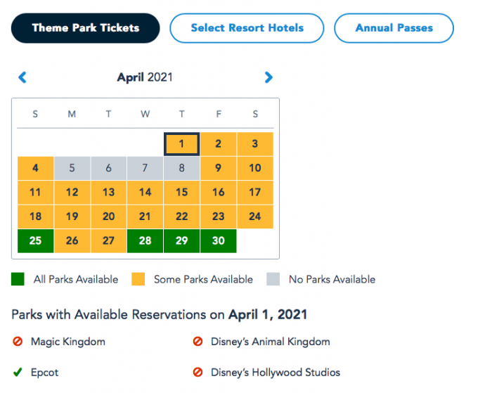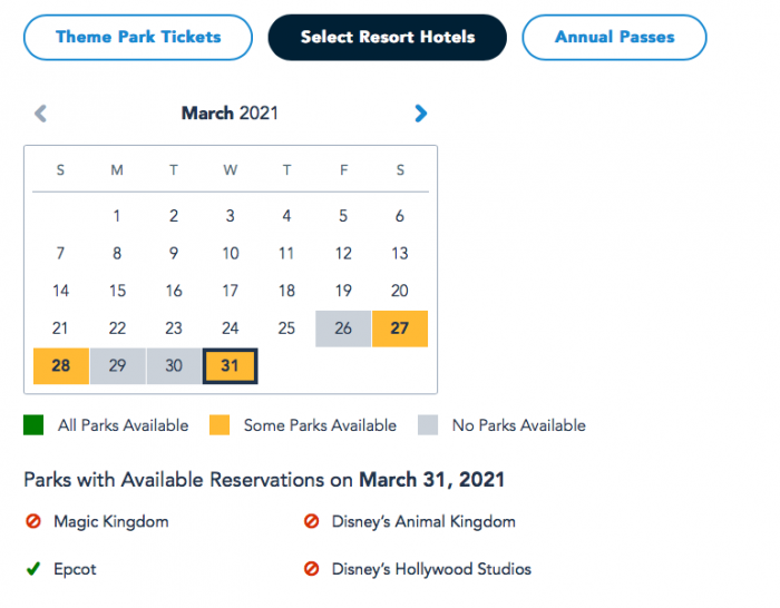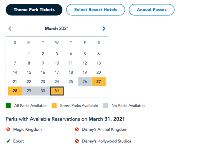 Things look similar for guests with Theme Park Tickets. On March 28th and March 31st, there appear to still be Park Passes available for EPCOT only. March 29th and 30th, however, appear to be completely booked.