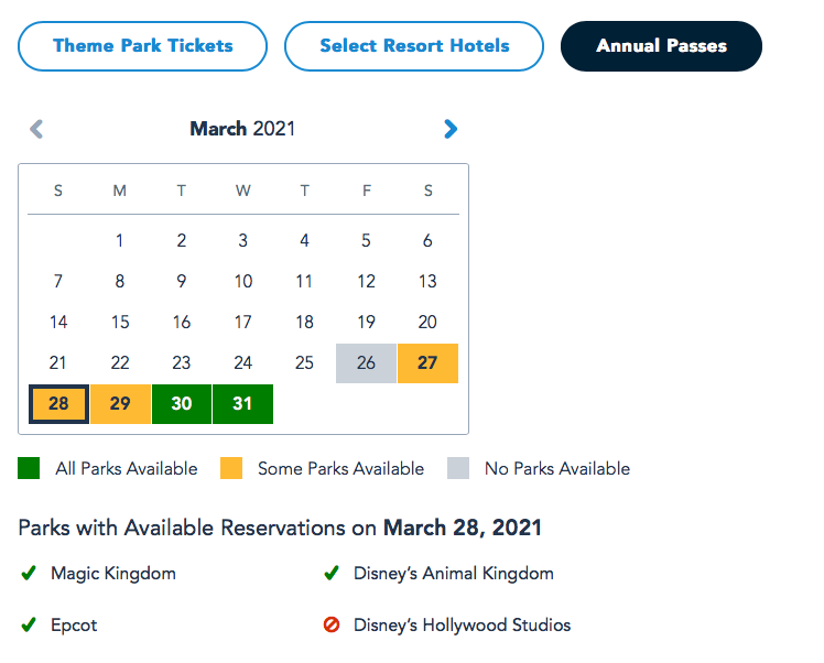 Things are a little different for Annual Passholders looking to book a Park Pass Reservation, however! On March 28th and March 29th, Park Passes are available at select parks. Right now, all parks except Disney’s Hollywood Studios are available on March 28th. All parks except Magic Kingdom are available on March 29th. And all parks are available March 30th and 31st.