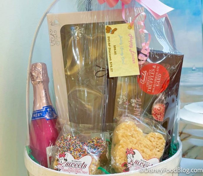 Here’s the catch though, this adult basket is going to cost you a pretty penny. Much like the create-your-own Easter baskets for kids, the cost of the basket is each item added up to one grand total so you’re looking at a price of $89.95 for this one. Those better be some really nice champagne flutes! Disney Vacation Club and Annual Passholder discounts do apply and that will bring your total down to $76.57.