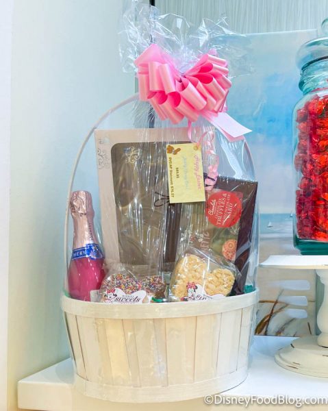 So, what exactly is included? Inside the pre-wrapped basket, you’ll find two Mickey-Shaped Rice Krispie treats, a box of Chocolate Truffles and Solid Chocolate Card, a bottle of champagne, and champagne flutes for serving!