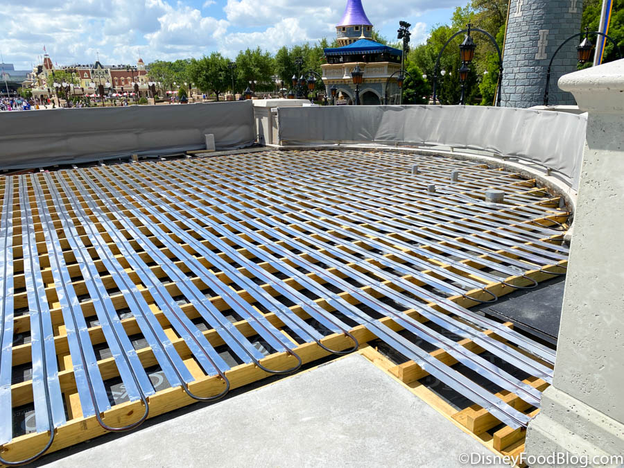Over by Cinderella Castle, the mystery construction treks on. At the castle stage, we’re keeping an eye on the progress as what seem to be wired strips are placed over the wooden frame.